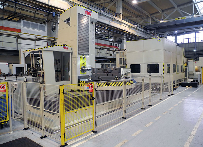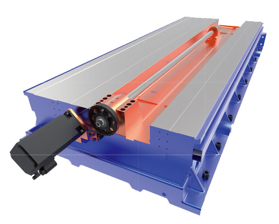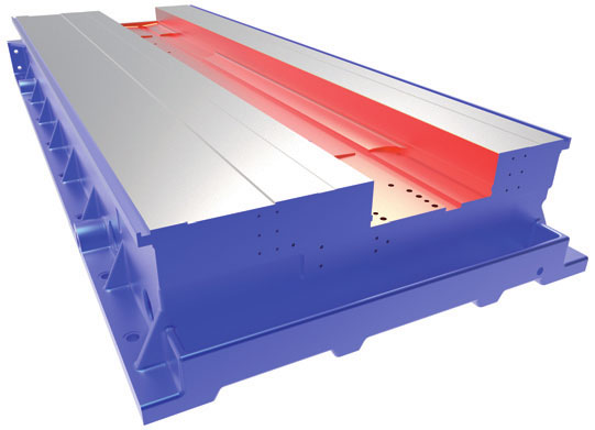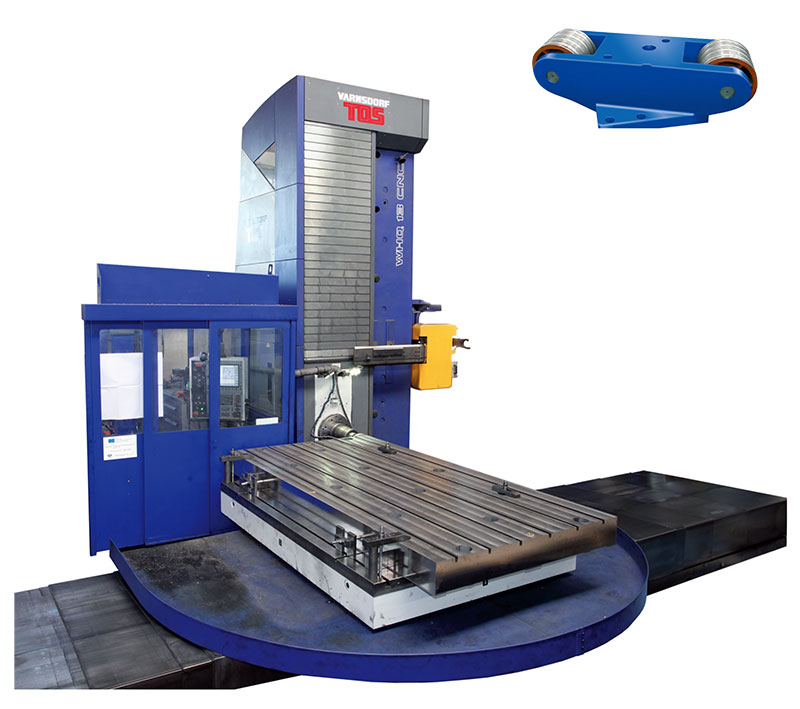 運(yùn)動(dòng)部件的導(dǎo)軌 所有直線(xiàn)軸都是滑動(dòng)導(dǎo)軌。 導(dǎo)軌表面采用激光淬火處理。 硬化鋼板內(nèi)嵌在導(dǎo)軌表面中央位置,和另一面的滾動(dòng)軸承單元配合。 配合面有配置低摩擦系數(shù)的復(fù)合材料。 另外,工作臺(tái)下方有四組滾動(dòng)軸承單元。床身上的導(dǎo)軌都采用伸縮護(hù)罩保護(hù),立柱導(dǎo)軌采用鋼板來(lái)防護(hù)。 工作臺(tái)坐落在環(huán)形滑動(dòng)導(dǎo)軌上,重載十字交叉軸承位于中心。 |